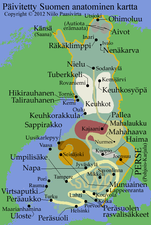 Laajojen lääketieteen ja kirurgian harrastukseen liittyvien tietojeni sekä myöskin syvällisen maamme tuntemuksen kautta julkaisen täten virallisen, Ainoan Oikean Suomen anatomisen kartan.